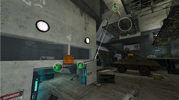 Lights are placed at key objectives to attract player attention. As shown in the image, players cannot enter this door because it is blocked by a Combine Fence, but they can see another entrance through the Combine Fence.