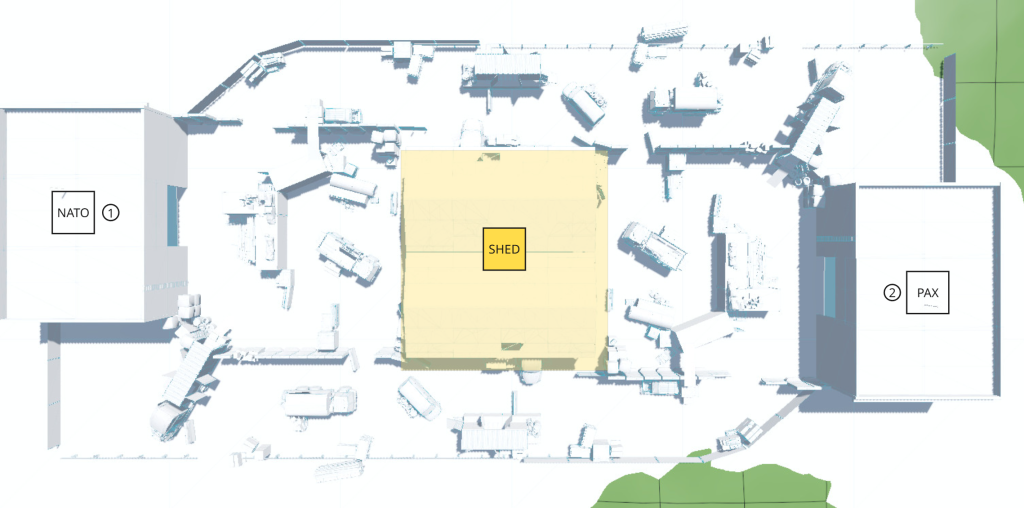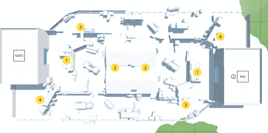 The map is set within a partially constructed warehouse that has been remotely destroyed by the PAX ARMATA. In response, NATO deploys an elite squad to escort cargo trucks and evacuate critical supplies, while PAX ARMATA ground special forces simultaneously land in the area, making a direct confrontation inevitable.