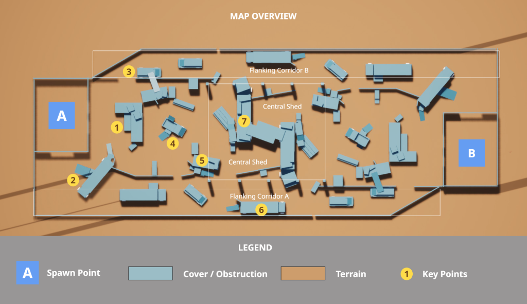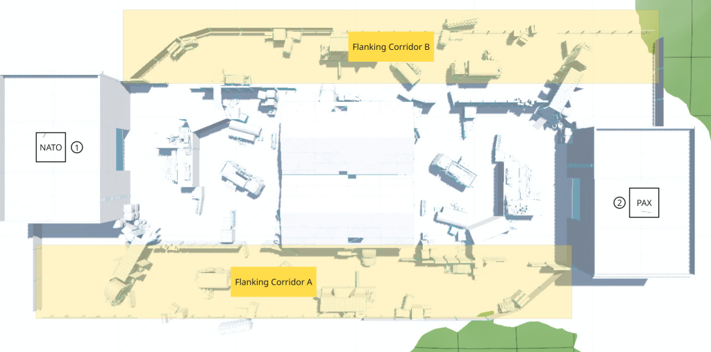 Flank corridors A and B provide each team with side routes, allowing for breakout maneuvers and the ability to break the stalemate in the middle without overwhelming the main combat lane.