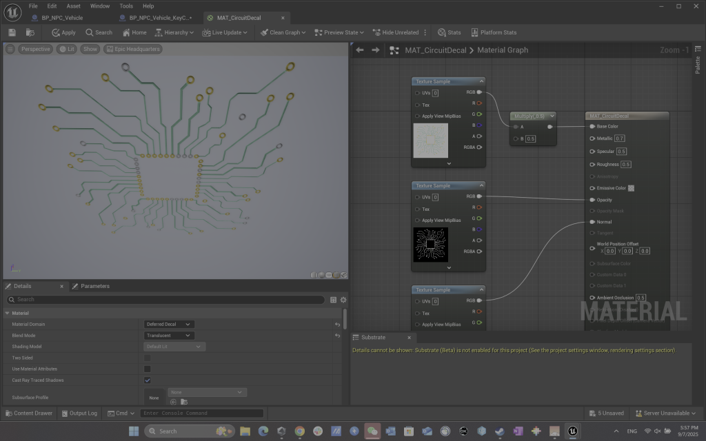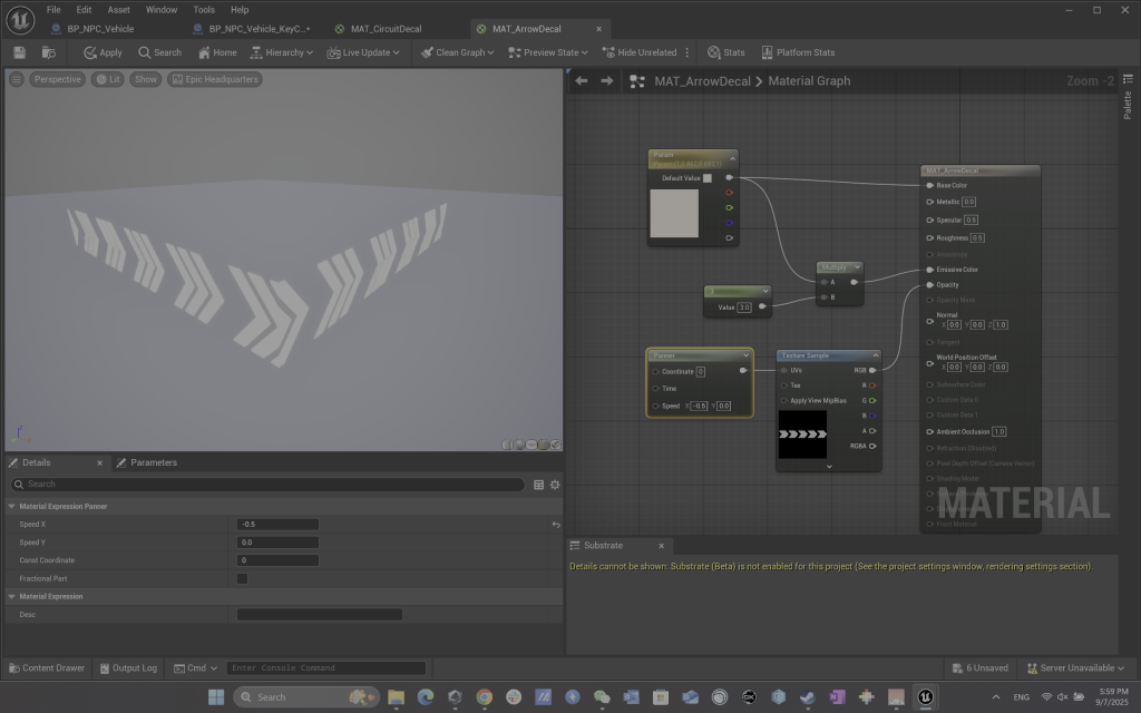 Guidance markers play an important role on the racetrack. I created a material blueprint with an exposed speed parameter and scalable properties, which was widely applied throughout the project’s tracks.