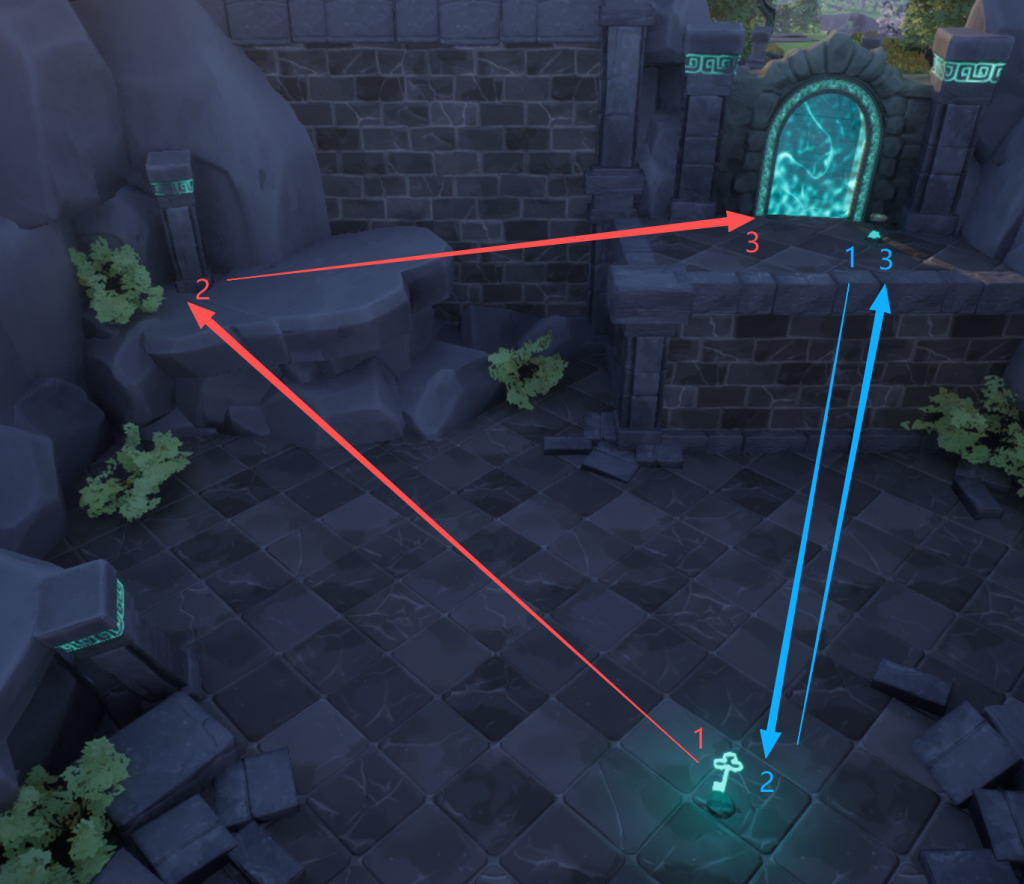 To remove the barrier, the player must insert the key into the hourglass. However, once picked up, the key disappears after a few seconds. If players follow the conventional path (red line in diagram) and carry the key toward the hourglass, the key expires before reaching the gate, causing failure.