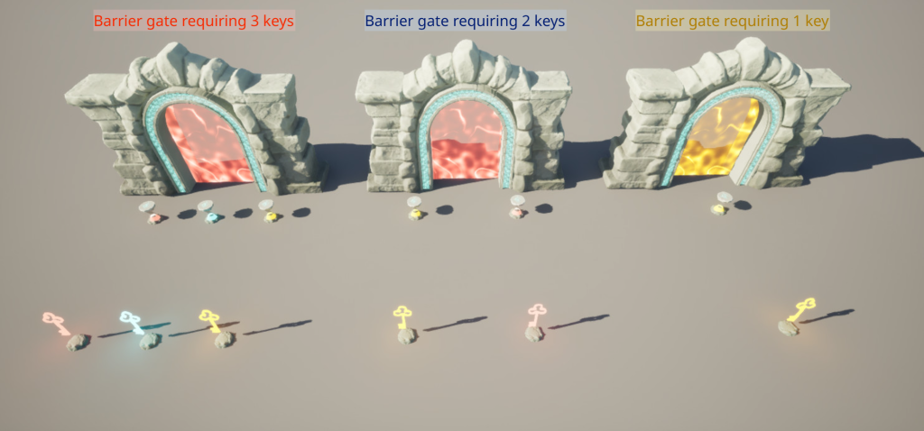 Level 3 features multiple Barrier Gate variants that require more complex conditions to unlock. For example, some gates demand two or even three keys.