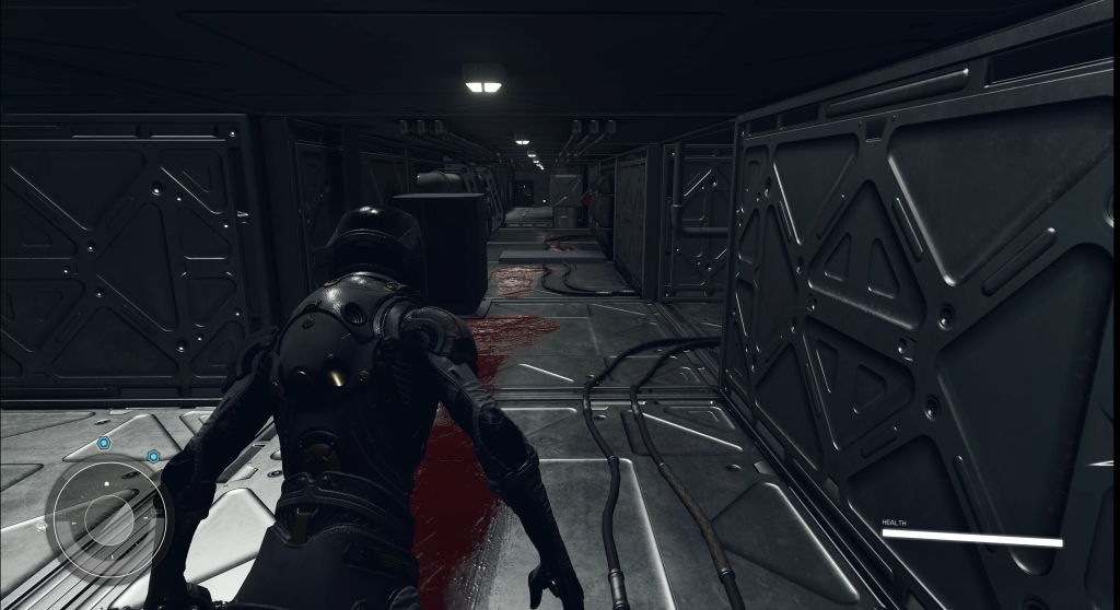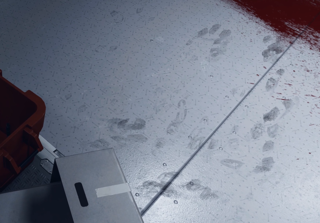 Silent Shift replaces exposition dumps with visual clues: blood stains on the ceiling, staggered footprints stopping at the entrance of an air vent, and flickering corridor lights that frame the path forward.