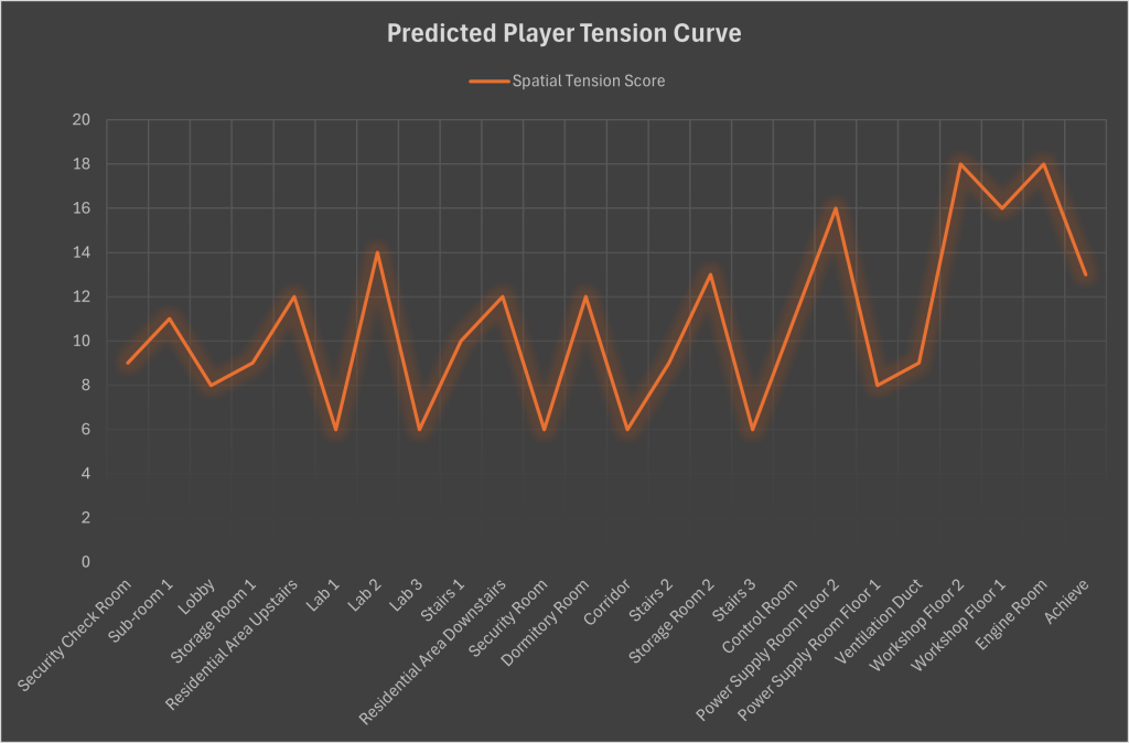 These spatial variations are arranged in sequence to create a designed tension curve for the player experience. High-density combat spaces are followed by calmer transitional areas, allowing tension to rise and release throughout the level.